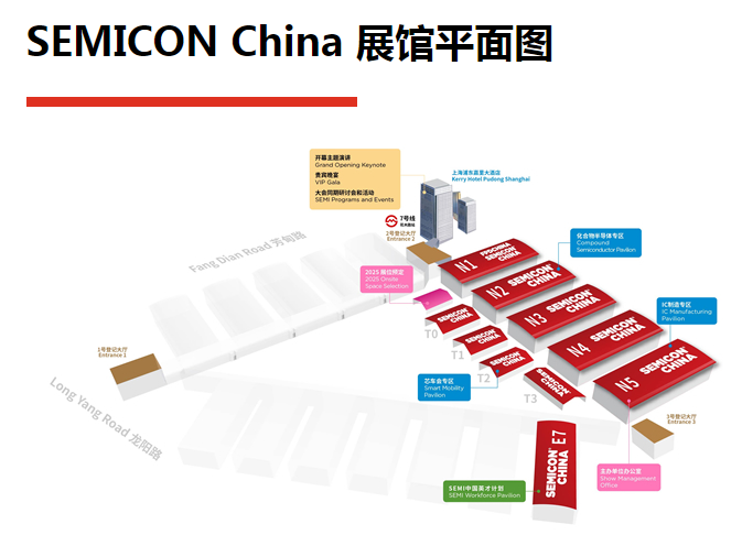 2024 SEMICON China 開幕在即此次設置了四個主題專區:IC 制造專區、化合物半導體專區、SEMI 中國英才計劃專區、芯車會專區。展館分布在 N1-N5、T01-T7、E3,還有更多盛大活動和同期會議與您共享半導體產業盛宴:開幕主題演講、英才計劃領袖峰會、半導體制造技術產業鏈論壇、創新投資高峰論壇、功率及化合物半導體國際論壇、中國元宇宙顯示大會-硅基顯示等。?